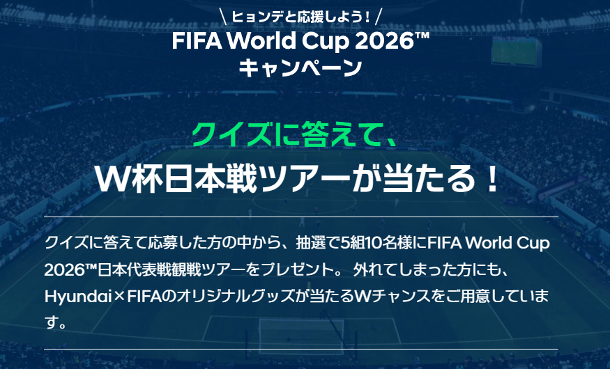 ヒョンデでは『クイズに答えて、W杯日本戦ツアーが当たる!キャンペーン』実施中です。