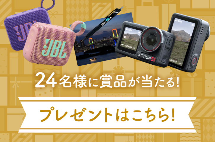 クイズとアンケートに答えて、応募して下さった方の中から抽選で、DJI アクションカメラ Osmo Action5 Pro スタンダードコンボが2名様に、スピーカー JBL Go 4が2名様に、首都高オリジナルグッズが20名様に当たります。