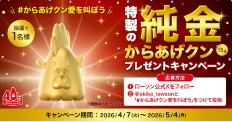 Xのローソン公式アカウント @akiko_lawson をフォローして、投稿文に「@akiko_lawson」と「#からあげクン愛を叫ぼう」をつけてポストすると、抽選で1名様に、特製の純金からあげクン(15g)が当たります。