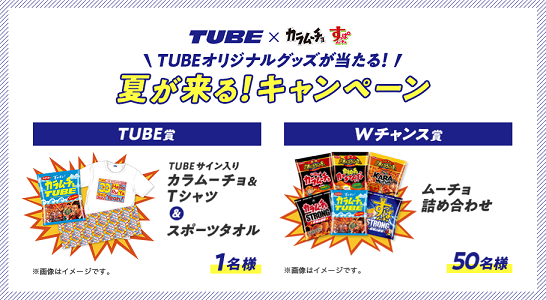 湖池屋では、『TUBEとムーチョが新曲発表!?夏が来る!キャンペーン』実施中です。抽選で1名様にTUBEサイン入りカラムーチョTシャツ&スポーツタオルが、Wチャンスではムーチョ詰め合わせが50名様に当たります。当選者数少ないのでレア度が高く...